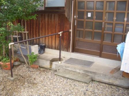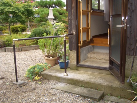 「離れ」の内部の手すりを取り付け、そこから一旦外にでて、「母屋」へ向かうための手すり。