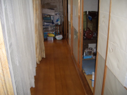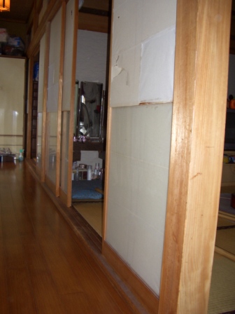縁側 手前の柱を曲がって短い廊下を通りピアノ室を横断しないと台所、トイレへは行くことができない。