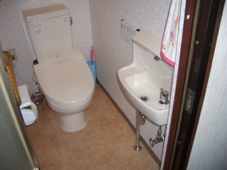 埋め込み式手洗いと、L型手すり、タオル掛けを設置しました。