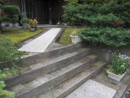 手摺の先は 玄関を向いており、玄関まで伸ばす必要となった場合、手摺を延長できるようにしておきました。